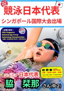 脇栞那さん(中2)競泳日本代表(ジュニア中学生世代)としてシンガポール国際大会出場