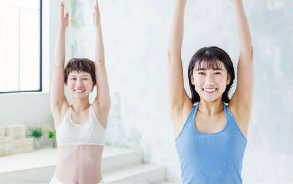 ヨガとピラティスの動きを取り入れ、明るく軽快な音楽に合わせて行うプログラムです。柔軟性の向上はもちろん、体力、集中力の向上、ストレス緩和が期待できます。